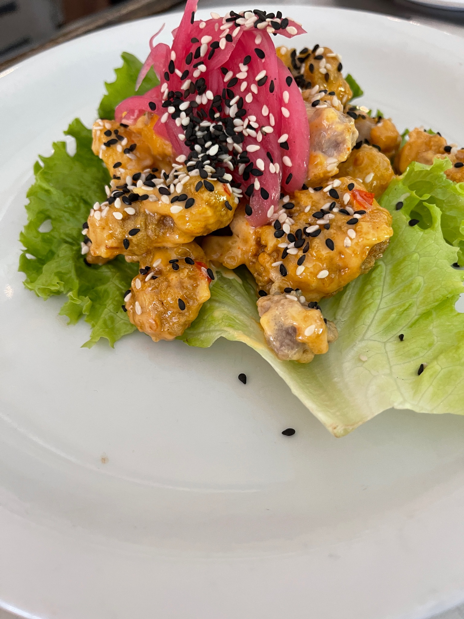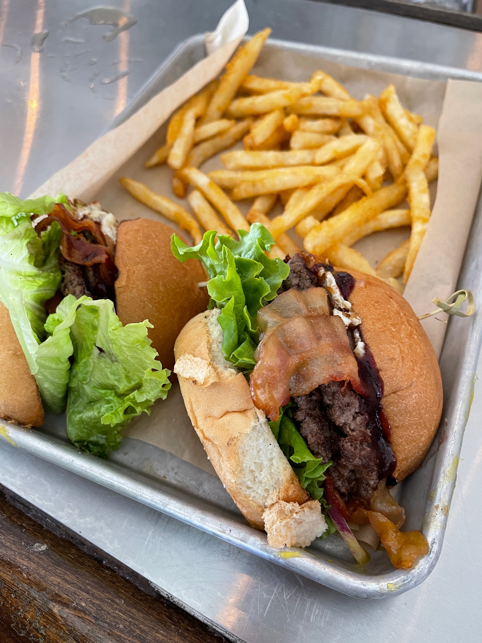 The food was delicious. They shared the fried gator tail as an appetizer, which had a surprisingly beautiful presentation! Rainer had the Cubano, Molly had the Wine Smash Burger and Phil & Chrissy split the Blue + Bleu Smash Burger.