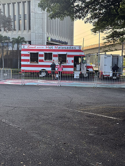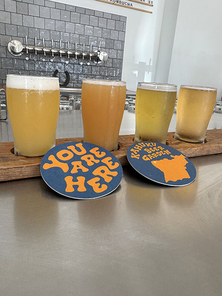 - Kahuku Sugar Mill – food trucks, restaurants, local shops and vendors. She ordered food from Da Bald Guy, which appeared on the tv show the great food truck race and the Netflix Street Food USA show. She had drinks at the Kahuku Beer Garden, a tap room with about 14 beers on tap, most from local breweries. Molly had a flight: Churro Cream Ale, Guava Donut Sour, Legends Hazy IPA and Shave Ice Seltzer. Rainer had Hibiscus Sunrise.