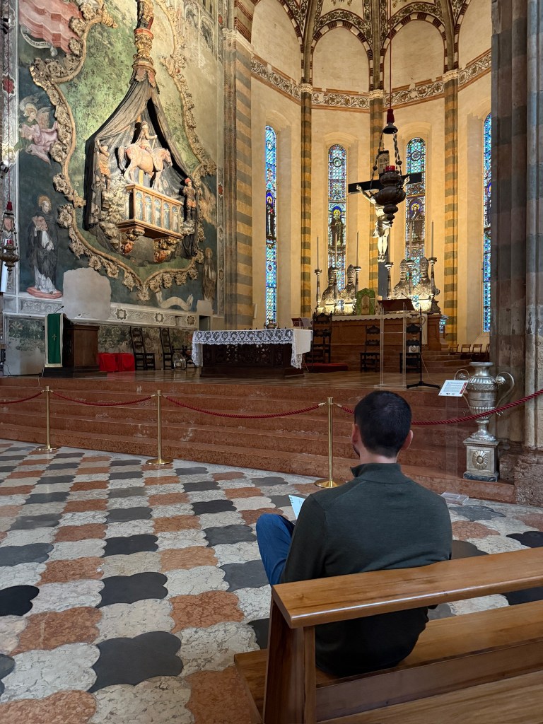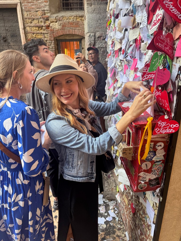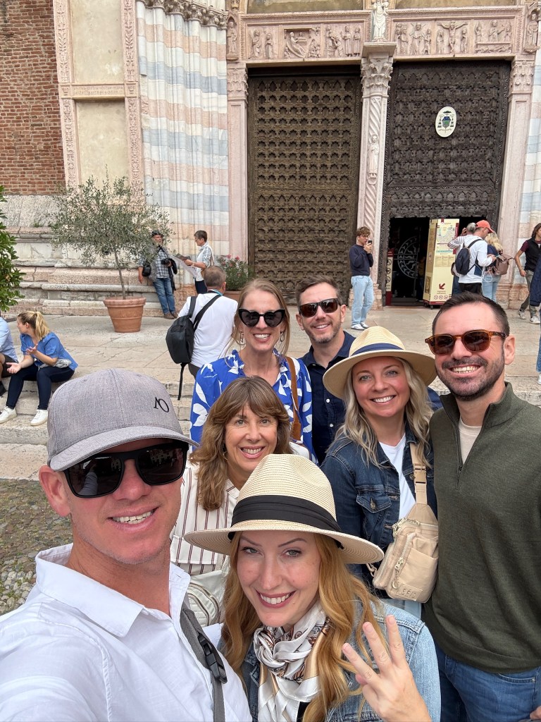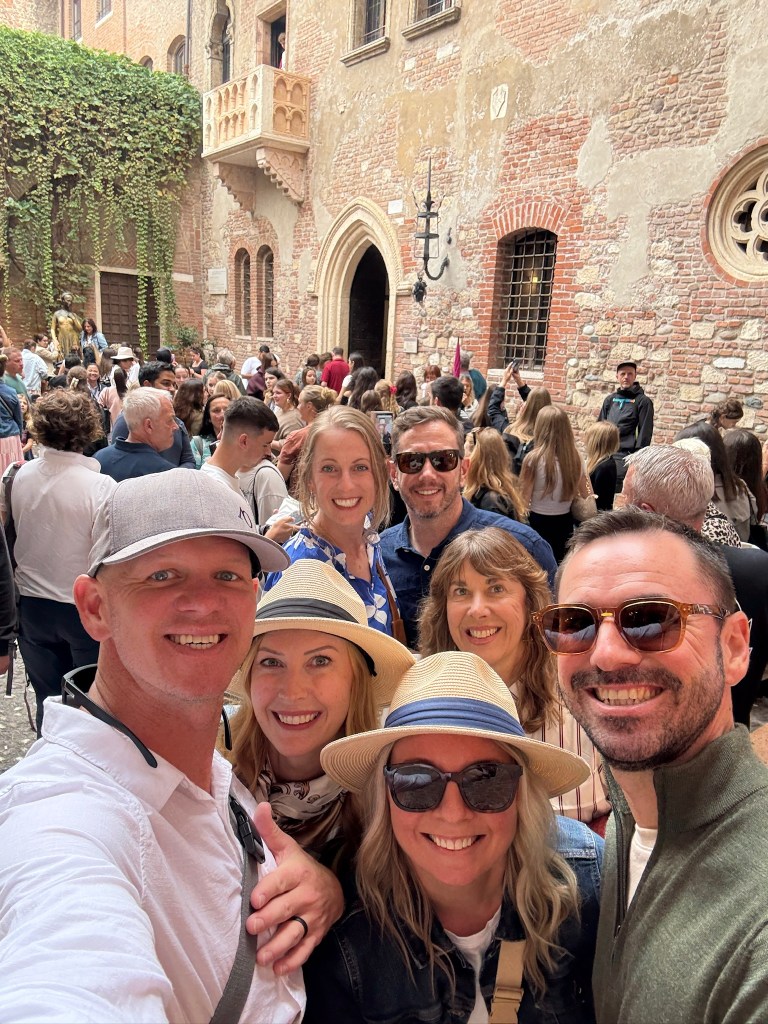 One of the most unique parts of the trip was a self-designed “Romeo and Juliet” themed pub crawl through the city. Complete with custom trivia questions (thanks to Chrissy), the crawl turned sightseeing into a friendly competition, with the winner earning a drink at the final stop. The route included lunch along the Adige River, a visit to the stunning Gothic Basilica di Santa Anastasia, and the famously crowded Juliet’s House, where visitors pose with the statue of Juliet and leave love letters in the courtyard.