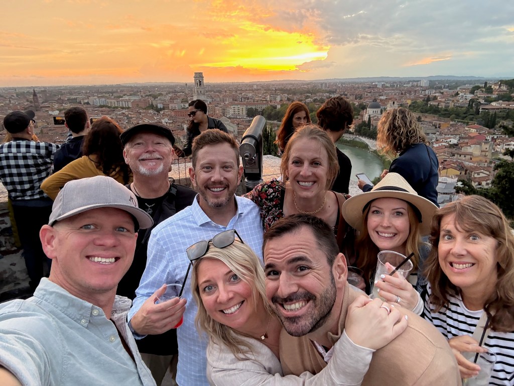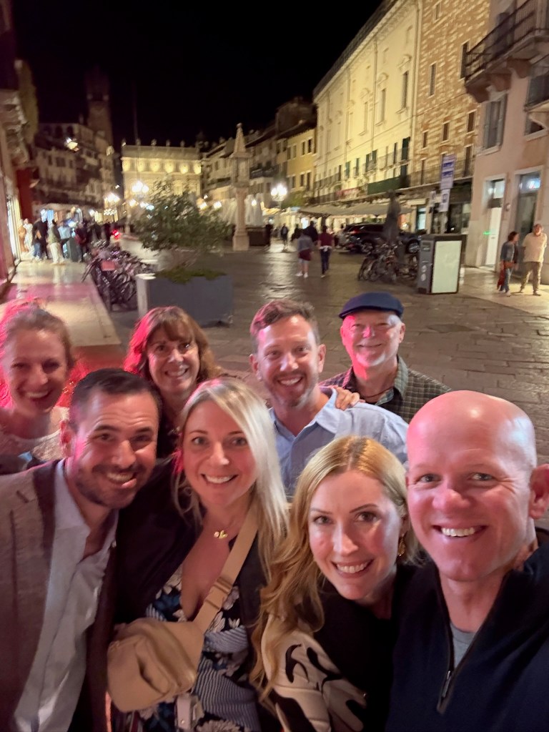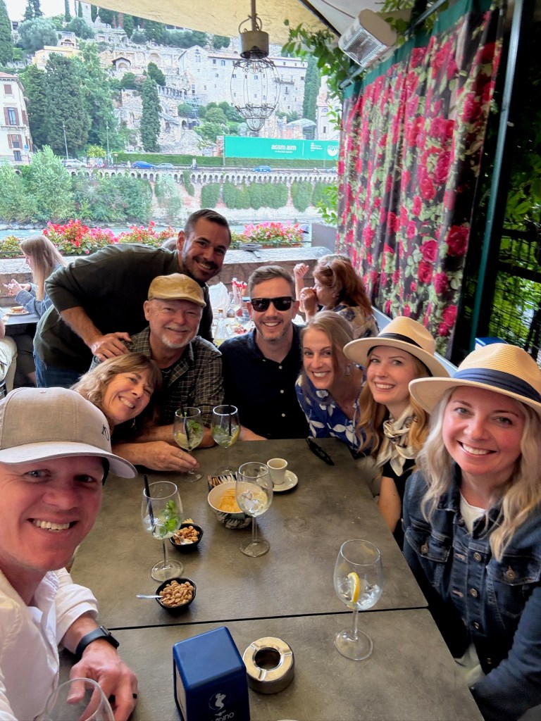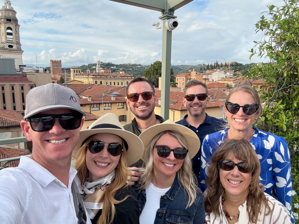 Chrissy, always loving to live like the locals, checked into her apartment, a short walk from the Vista Verona. The group met here after everyone got settled to head over to the Castel San Pietro. They took a funicular up to the castle which leads to a panoramic viewpoint overlooking the Adige River, the city’s red rooftops, and Verona’s historic center. At sunset, the view becomes one of the most memorable moments of the trip and a must-do for visitors with limited time in the city.