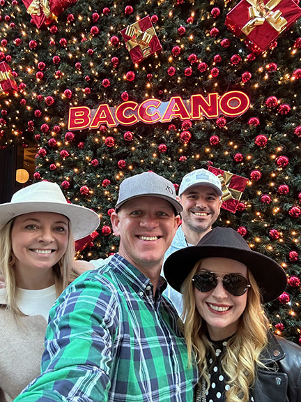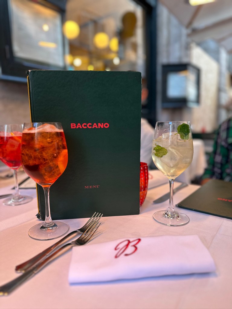 Next stop was the Trevi Fountain, but the girls didn’t wait in line to throw in coins. Go early! The line stretches pretty far! The girls moved on past the Trevi Fountain and around the corner to Baccano for cocktails and appetizers. The girls were seated outside along the street and absorbed the bustling ambiance will sipping spritzes and enjoying carpaccio and tartare. It was about a month before Christmas and Baccano nailed it with the decorations – it was beautiful!