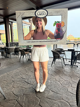 Sangria University is held at Three Bridges Bar & Grill at Disney’s Coronado Springs Resort. It’s a 90-minute class of the history of sangria making (with a little Disney history sprinkled in) that includes four samples of a variety of sangrias and a light appetizer. You learn about each sangria on the flight – each a different variety including a red, a white, a rosé and a sparkling sangria. The class concludes with a final exam where students create their own sangrias choosing from a variety of wine bases, liquor options, enhancements and flavors.