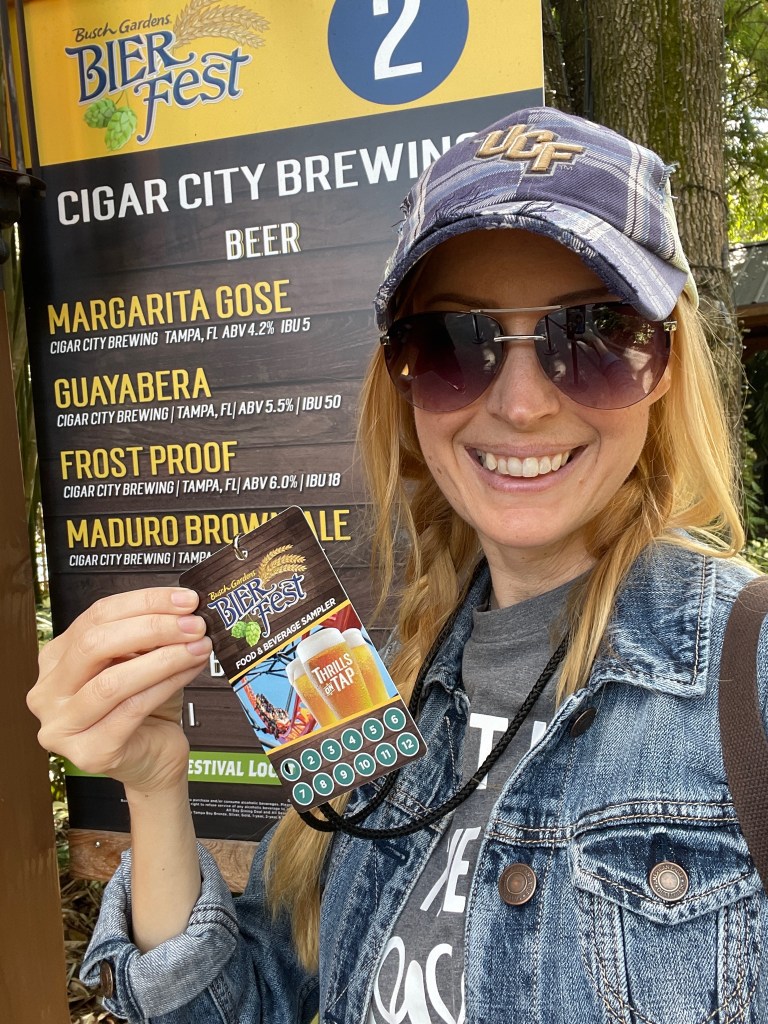 With your Busch Gardens admission ticket you have access to Bier Fest. Each item, food or beverage, is sold ala carte. Food ranges from about $6 – $10 per item, and drinks are about $11. BUT! They offer a sampler ticket! This is a must-have. If you listened to the Booze Cruise episode, youโll remember the girls discussing the drink package. They both love to purchase this ahead of time so the trip is worry-free when it comes to tallying up drink costs. This Busch Gardens Bier Fest Sampler is kind of like that. When purchased, the holder gets a card with a lanyard that gets punched with each sample – food or beverage (note, it’s full size food offerings, but 7oz beer or cocktail samples). Prepay and taste away!